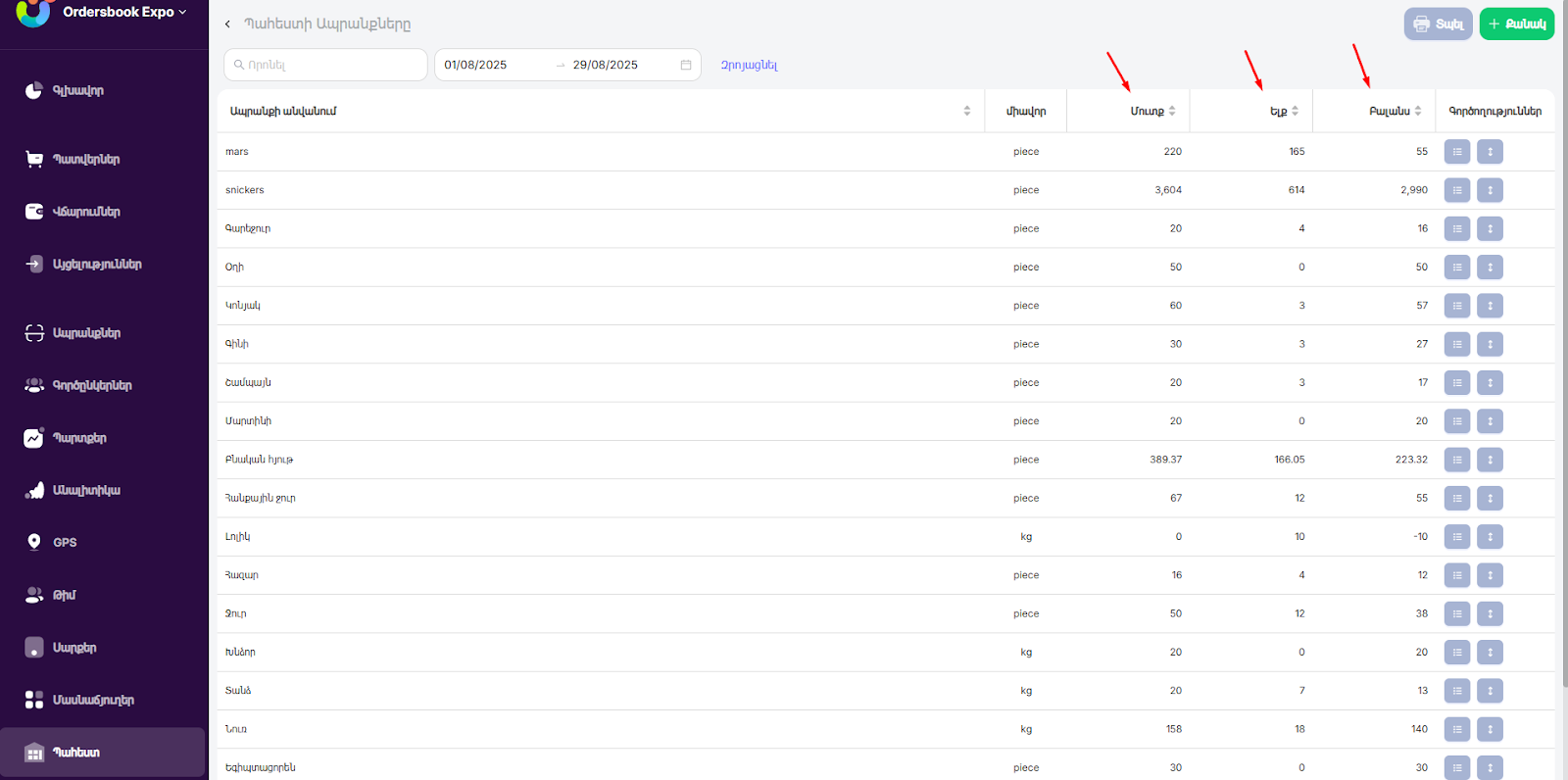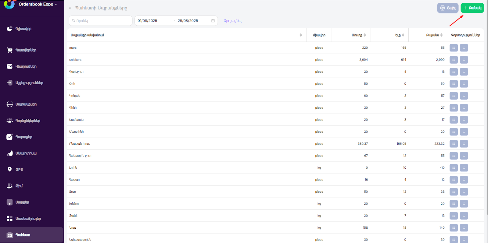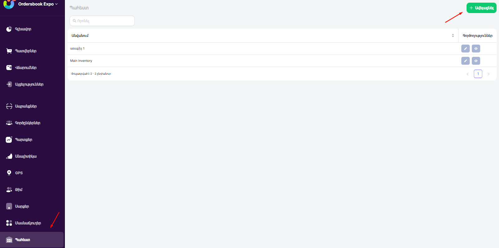 Հիմնական մենյուից ընտրելով «Պահեստ» բաժինը, դուք կարող եք տեսնել ձեր բոլոր պահեստները։