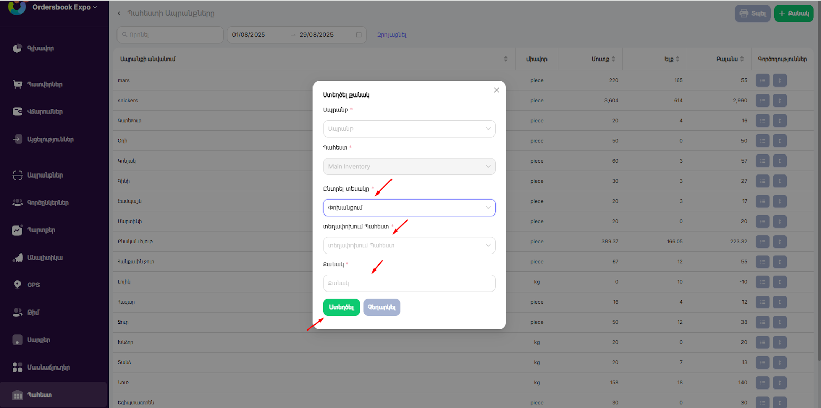 - Ընտրեք նպատակային պահեստը և մուտքագրեք անհրաժեշտ քանակը։